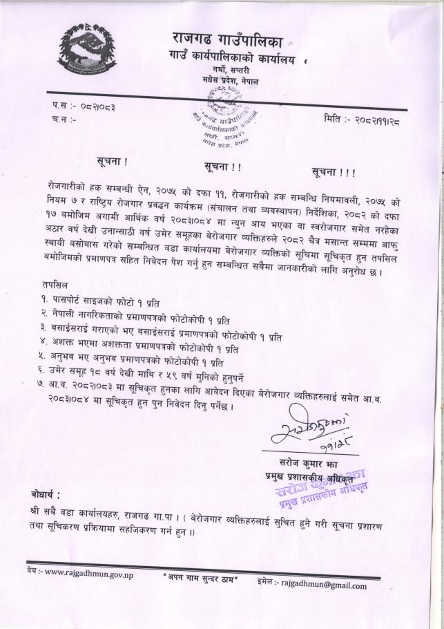 बेरोजगार व्यक्तीहरुको सूचिकृत सम्वन्धमा।