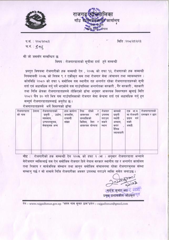 बेरोजगार व्यक्तीहरुको सूचिकृत सम्वन्धमा।