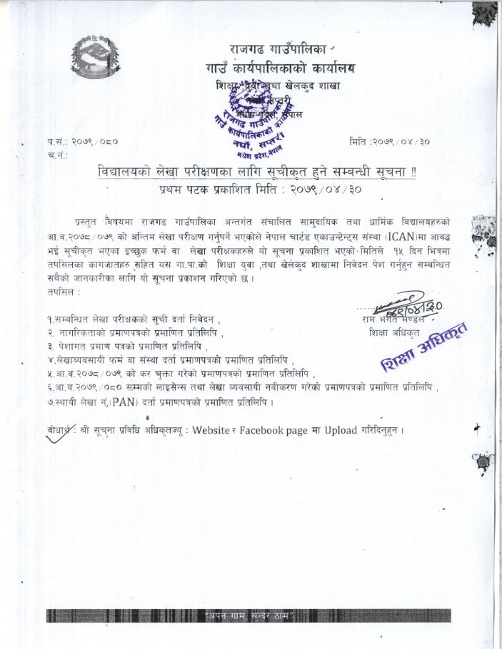 विद्यालयको लेखा परिक्षणका लागि सूचिकृत हुने सम्वन्धी सूचना !!!